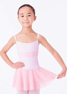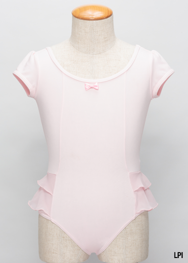 胸元のリボンとダブルシフォンのスカートがかわいいキッズレオタード。スカート部分は、動きのじゃまにならないシンプルなデザインのため、小さなお子さまでものびのびとレッスンしていただけます。色はお子さまの大好きなオフホワイト・ライトピンクの2色のパステルカラーをそろえました。