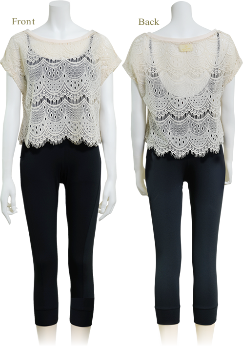 黒のレオタード×スパッツのシンプルスタイルに、レーストップスをプラスしてオシャレに!