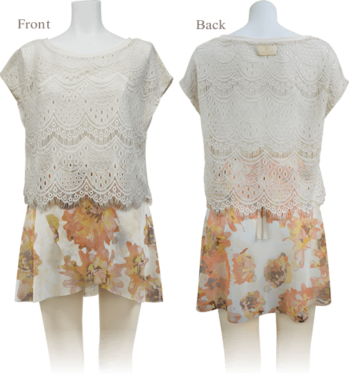 レーストップスがさりげなく上半身をカバーしながら、軽やかな印象に。元気なオレンジは夏こそ着たい色。