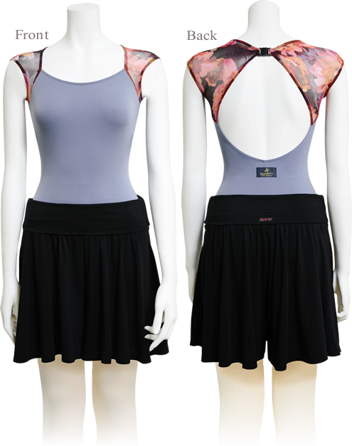 ボトムスとレオタードは落ち着いた色合いを使いながら、顔回りにプリントチュールの鮮やかさを加えて明るい印象に。