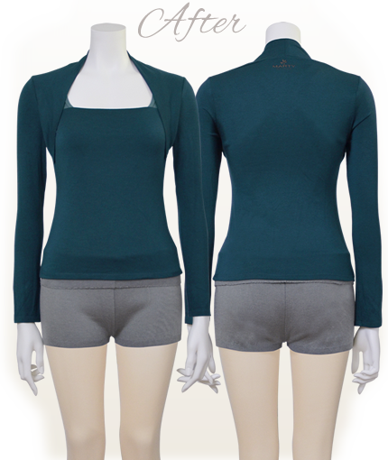 うなじの冷えをカバーするこちらのトップスは、洗練されたデザインで大人の女性にぴったり。トップスを脱いでも、レオタードのバッククロスとハートネックのラインが美しく、上品な印象にしてくれます。